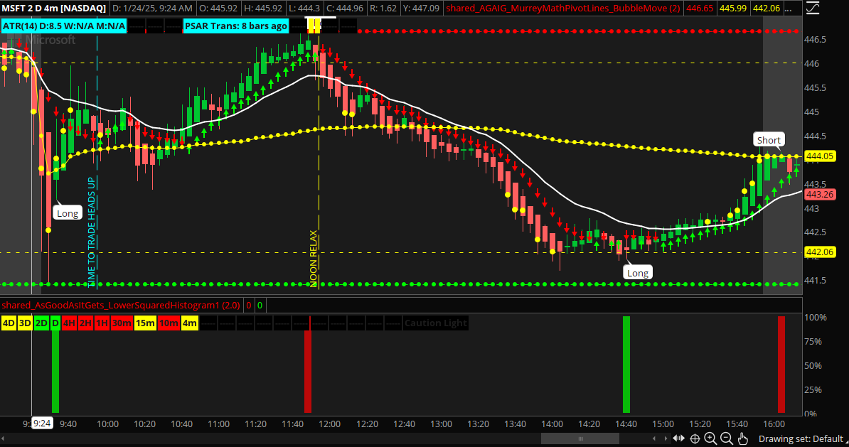 I’m using the Long/Short Bubbles and Lower Squared Histograms for entry/exits after looking back 2-3 days to see what the average intraday movement (AIM) has been and use that average for expected intraday movement.