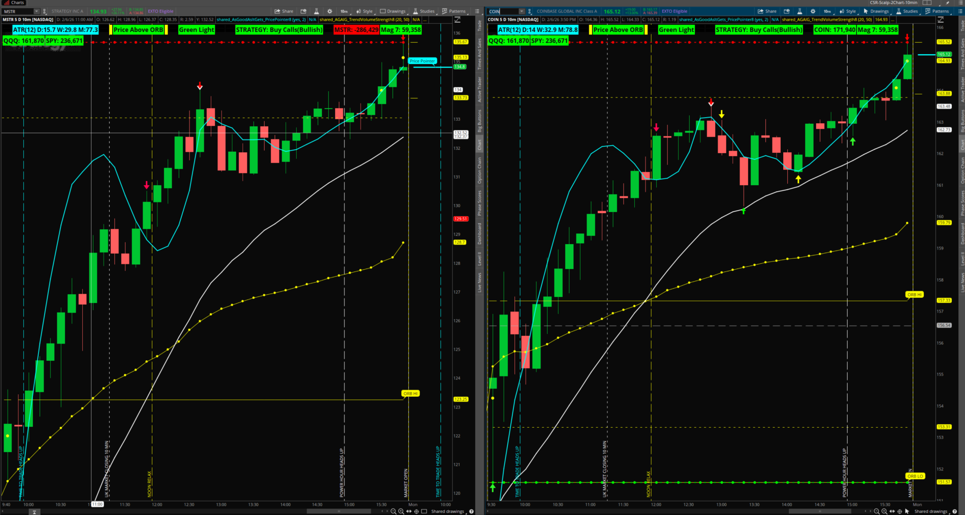 On these charts my labels are: ATR (Average True Range), Price Above, Within, or Below the Opening Range Breakout (ORB), My Traffic Light Indicator, STRATEGY: Buy Calls (Bullish) = Green, or Buy PUTS (Bearish) = Red.