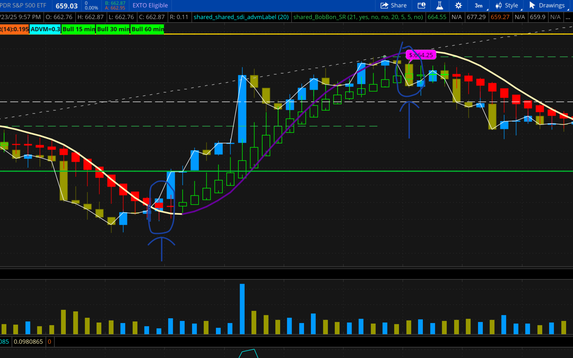 Now to my question.....in the second picture, of the 3m SPY timeframe, the HA candles are a special study, while the blue and mustard candles are the standard view of my chart. I've also added a SMA 1-period white line, based on the closing standard candle price. What I'm looking to do is create some kind of sound and visual alert for instances where the normal candle close (the white line) was entirely above the full range of the HA candle (including wicks) and the HA candle was red, and also for instances where the normal candle close (again, the white line) sat below the entirety of a green HA candle.