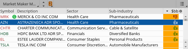 Regarding the code on the main page of this thread, I'm finding the signal on the chart does not exactly correlate to the thumbs up signal in the watchlist column. The watchlist will show a thumbs up even if the arrow up on the chart came 5-10 bars ago, even on a daily.