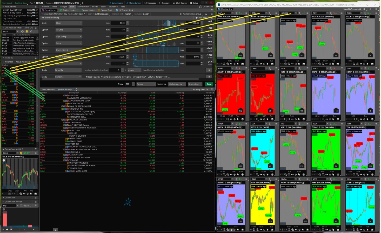 I currently manually create a watchlist from the scan results, then manually select a stock for each chart in the grid. Takes time, is cumbersome, and slows things down in the middle of the day as stocks join/drop off the scan.