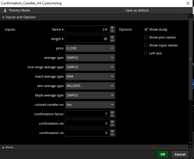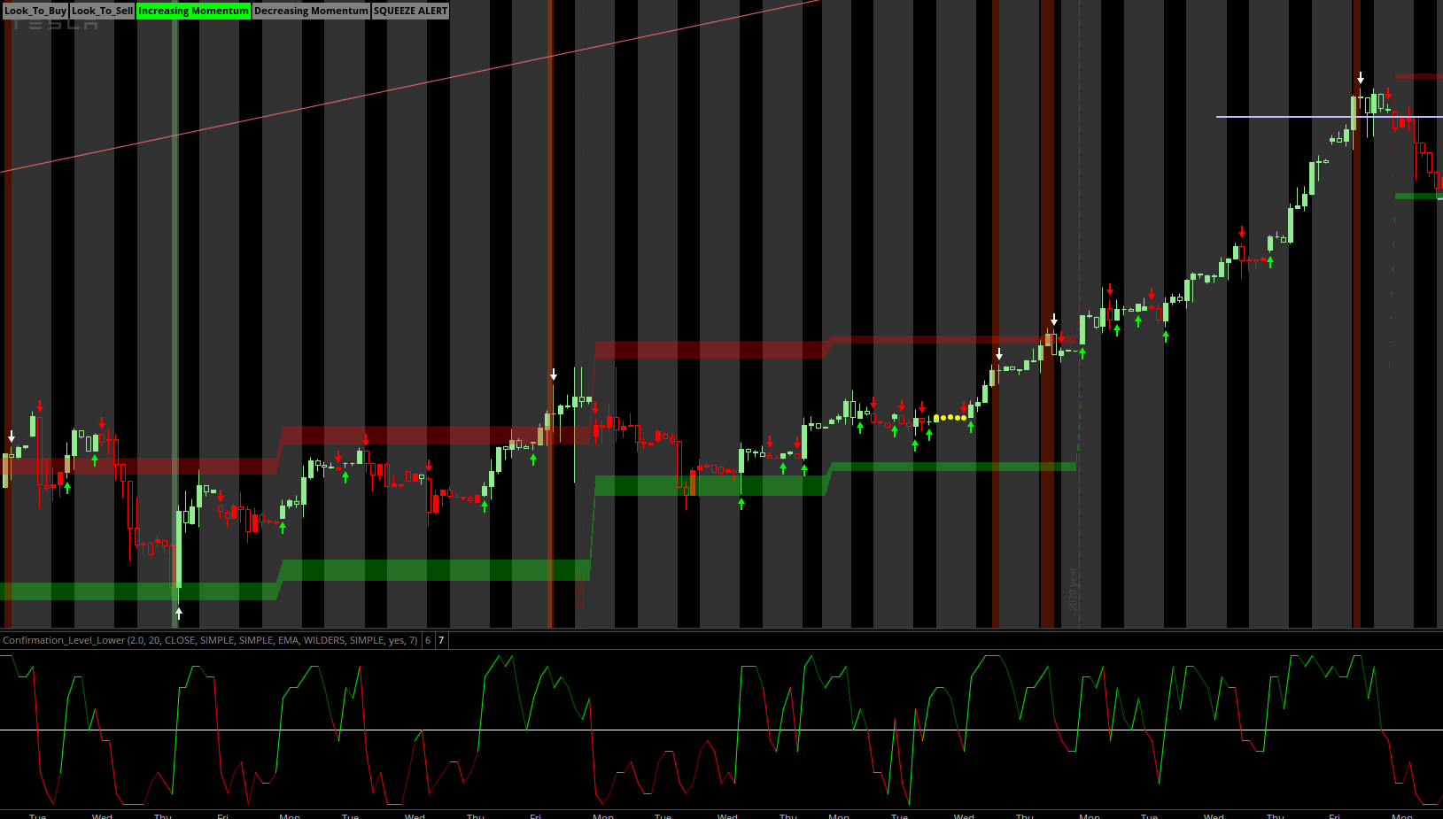 For those of you trying out the Confirmation Candles, here is version 4. OB and OS confirmation levels have now been included (white arrows and adjustable confirmation levels), as well as labels for "Look To Buy" "Look To Sell" zones (shaded green/red), Mean Reversion and Breakout. Magenta points are reversal alert. I have included a Keltner Channel as well, with an easily adjustable factorK. Looking forward to feedback. Enjoy!