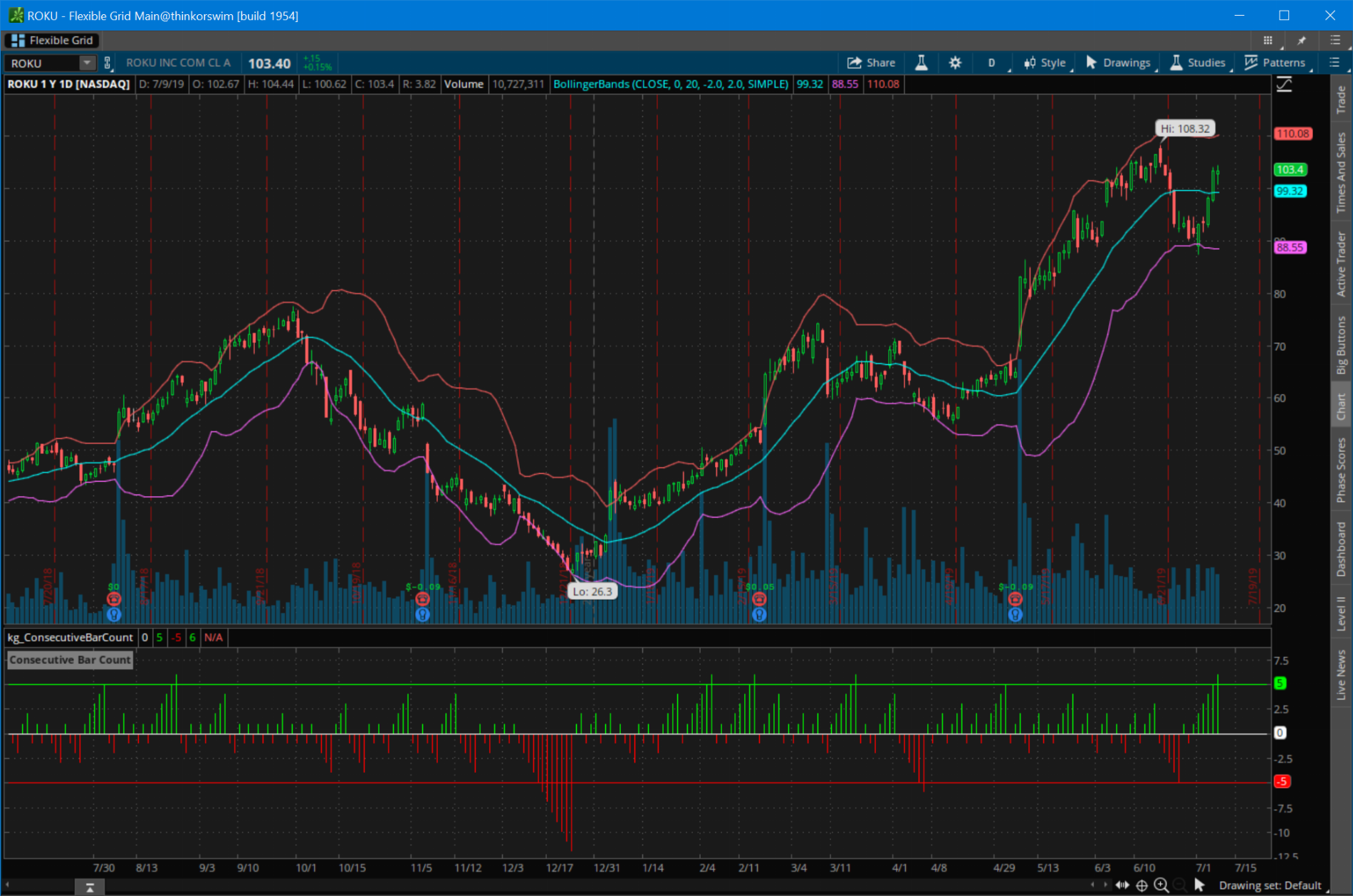 This is also an example of how to count things in thinkscript. If you are new to thinkscript, remember that your code runs on each bar and calculates everything based on that bar and any forward or backward looking values (like close[1] being the close 1 bar in the past). You can also reference the values of your own variables!
