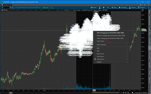 Now that you have data, you can back test your strategies with code outside thinkorswim. Note, you can only export up to 30 days of 1-minute data. You can use OnDemand to load data beyond that, but for this amount of work, maybe getting data from a provider is a better route. Kibot, http://www.kibot.com/, is a good source, and you can find others on the web. Lastly, if you only export the subset of data you need, you can save a lot of time running the strategy in thinkorswim.