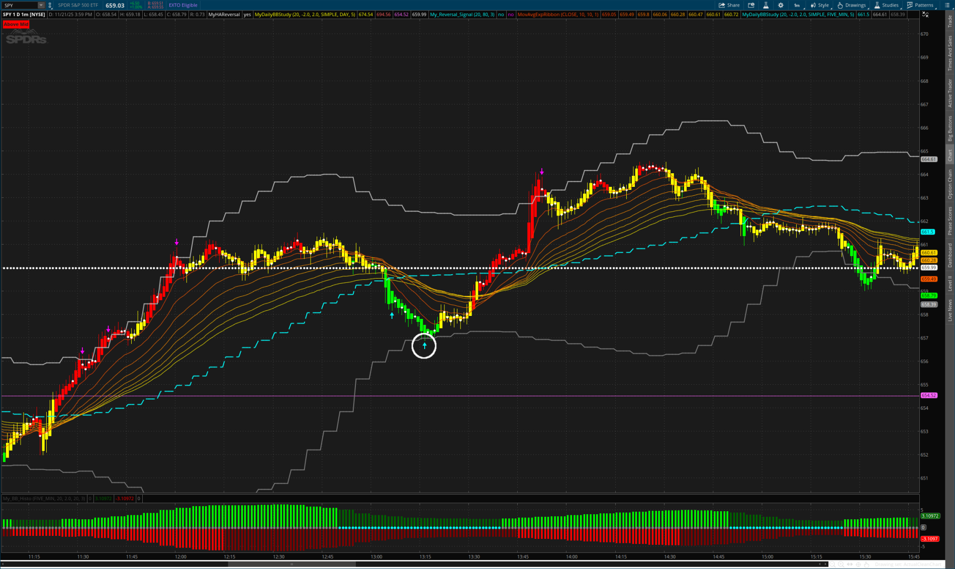 This is what I mean by reversal, and is a textbook example from today on SPY. This is using my own set of custom indicators. They don't always play out like this, and could've kept on running down the bottom bollinger. This is my challenge is trying to find SOMETHING that adds confluence to this. I've tried adding in levels defined by the community but they don't always help and just adds noise.