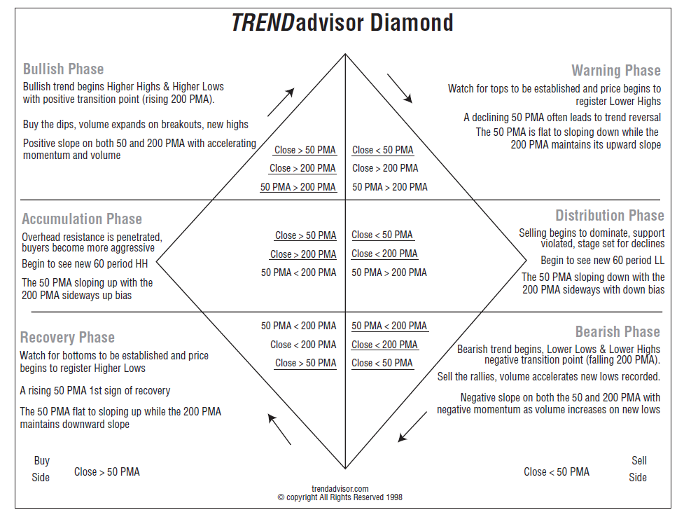 # Define criteria for Warning Phase : close < 50 SMA, close > 200 SMA, 50 SMA > 200 SMA