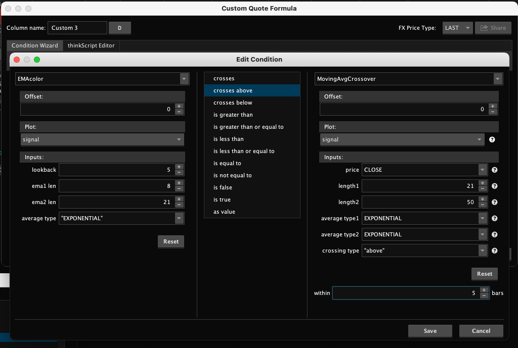 If anyone uses EMA crossover as a way to identify trend or point of entry/exit, knowing when there is a moving average crossover on your watchlist column can certainly be helpful. Here is a quick snippet that let you do just that.