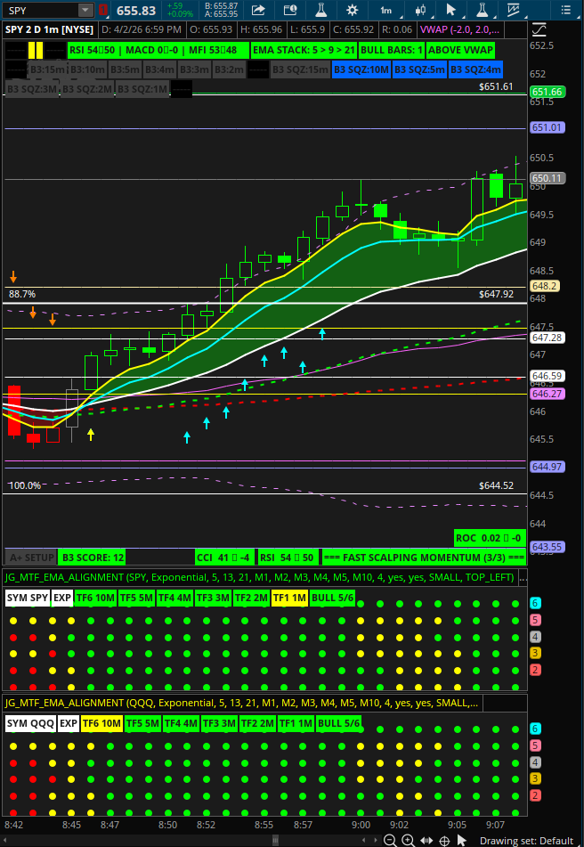 Multi‑Timeframe CompressionSee 1m through 1h structure without opening multiple chartsTF1–TF6 grid provides a full trend map in one lower pane