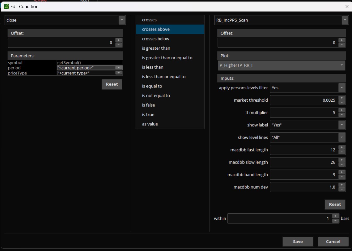 Thanks so i tried the new scanner code EXAMPLE and if i wanted to scan when price is greater than the hourly P_Higher_RR What tf multiplier would I use 60 ? or 5 default also I am on the 1 min chart with hourly P_Higher_RR ...so on the scan would I use the hourly scan or the 1 min to scan for that example I tried both Ways and the scanner code is not producing the results i wanted in either where PRICE is greater than