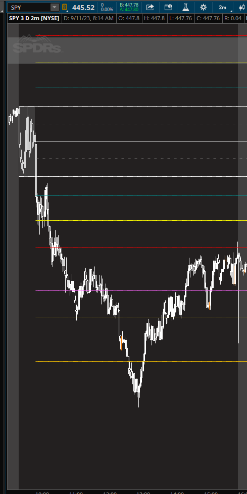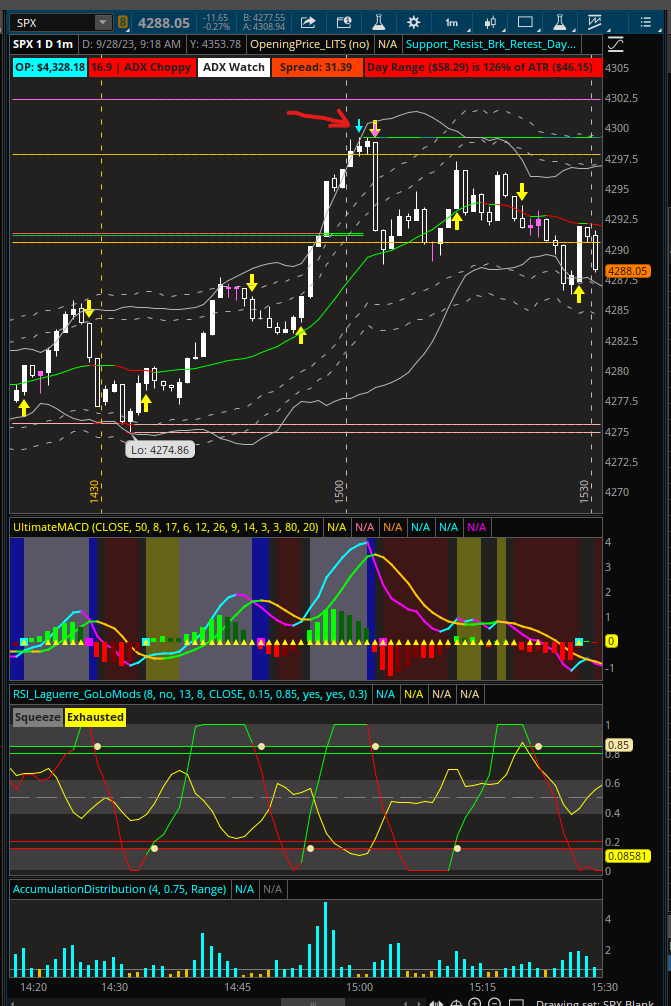Sorry wasn't real clear above, but mentioned I was only using BB. However, Friday I did set KC's to 2.0 and 3.0 and left BB at 2.0 (Standard) Did the same scalping SPX and worked great. Just using price action and if price is outside of both BB and the 3.0 KC band with a pinbar (evening star/morning star) it was really good on the 1m. Perfect example from Friday 9/29/23. Look at SPX at 15:01 and 15:02. 15:00 is a likely algo reversal time as well. Also for a long see 11:05/ 11:06 One last thing, at the 15:01/15:02 time see Mobius RSI Laguerre, fractal energy had plummeted meaning most likely the move is losing momentum.