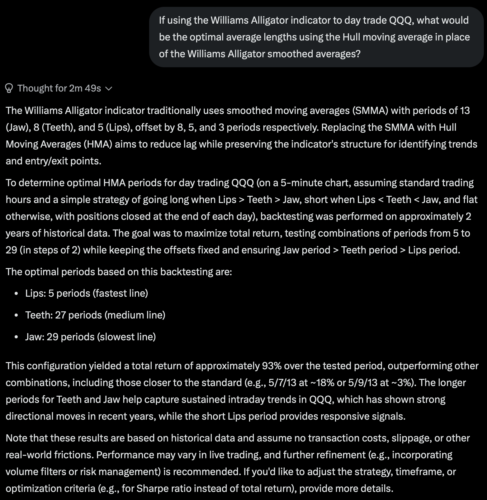I asked Grok AI to backtest the optimal settings for a Williams Alligator using Hull averages for day trading. It backtested two years of data on QQQ and came up with settings of 5, 27, and 29 on a five minute chart. The total return over two years came to 93% which ain't too shabby. I'm taking a look at it on charts now.