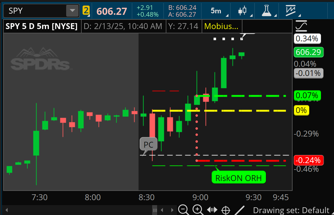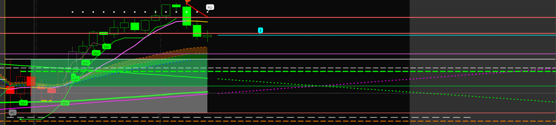 Code:declare Hide_On_Daily; declare Once_per_bar; input OrMeanS = 0930.0; #hint OrMeanS: Begin Mean Period. Usually Market Open EST. input OrMeanE = 0935.0; #hint OrMeanE: End Mean period. Usually End of first bar. input OrBegin = 0930.0; #hint OrBegin: Beginning for Period of Opening Range Breakout. input OrEnd = 1000.0; #hint OrEnd: End of Period of Opening Range Breakout. input CloudOn = no; #hint CloudOn: Clouds Opening Range. input AlertOn = yes; #hint AlertOn: Alerts on cross of Opening Range. input ShowTodayOnly = {"No", default "Yes"}; input nAtr = 4; #hint nATR: Lenght for the ATR Risk and Target Lines. input AtrTargetMult = 2.0; #hint ATRmult: Multiplier for the ATR calculations. def h = high; def l = low; def c = close; def bar = barNumber(); def s = ShowTodayOnly; def ORActive = if secondsTillTime(OrMeanE) > 0 and secondsFromTime(OrMeanS) >= 0 then 1 else 0; def today = if s == 0 or getDay() == getLastDay() and secondsFromTime(OrMeanS) >= 0 then 1 else 0; def ORHigh = if ORHigh[1] == 0 or ORActive[1] == 0 and ORActive == 1 then h else if ORActive and h > ORHigh[1] then h else ORHigh[1]; def ORLow = if ORLow[1] == 0 or ORActive[1] == 0 and ORActive == 1 then l else if ORActive and l < ORLow[1] then l else ORLow[1]; def ORWidth = ORHigh - ORLow; def na = double.nan; def ORHA = if ORActive or today < 1 then na else ORHigh; def ORLA = if ORActive or today < 1 then na else ORLow; def O = ORHA - Round(((ORHA - ORLA) / 2) / TickSize(), 0) * TickSize(); def ORActive2 = if secondsTillTime(OREnd) > 0 and secondsFromTime(ORBegin) >= 0 then 1 else 0; def ORHigh2 = if ORHigh2[1] == 0 or ORActive2[1] == 0 and ORActive2 == 1 then h else if ORActive2 and h > ORHigh2[1] then h else ORHigh2[1]; def ORLow2 = if ORLow2[1] == 0 or ORActive2[1] == 0 and ORActive2 == 1 then l else if ORActive2 and l < ORLow2[1] then l else ORLow2[1]; def ORWidth2 = ORHigh2 - ORLow2; def TimeLine = if secondsTillTime(OREnd) == 0 then 1 else 0; def ORmeanBar = if !ORActive and ORActive[1] then barNumber() else ORmeanBar[1]; def ORendBar = if !ORActive2 and ORActive2[1] then barNumber() else ORendBar[1]; def ORL = if (o == 0 , na, o); plot ORLext = if barNumber() >= highestAll(ORmeanBar) then HighestAll(if isNaN(c[-1]) then ORL[1] else double.nan) else double.nan; ORLext.SetDefaultColor(color.Yellow); ORLext.SetStyle(curve.Long_DASH); ORLext.SetLineWeight(3); ORLext.HideTitle(); def ORH2 = if ORActive2 or today < 1 then na else ORHigh2; plot ORH2ext = if barNumber() >= highestAll(ORendBar) then HighestAll(if isNaN(c[-1]) then ORH2[1] else double.nan) else double.nan; ORH2ext.SetDefaultColor(color.Green); ORH2ext.SetStyle(curve.Long_DASH); ORH2ext.SetLineWeight(3); ORH2ext.HideTitle(); def ORL2 = if ORActive2 or today < 1 then na else ORLow2; plot ORL2ext = if barNumber() >= highestAll(ORendBar) then HighestAll(if isNaN(c[-1]) then ORL2[1] else double.nan) else double.nan; ORL2ext.SetDefaultColor(color.Red); ORL2ext.SetStyle(curve.Long_DASH); ORL2ext.SetLineWeight(3); ORL2ext.HideTitle(); def RelDay = (ORL - ORL2) / (ORH2 - ORL2); def dColor = if RelDay > .5 then 5 else if RelDay < .5 then 6 else 4; def pos = (ORH2 - ORL2)/10; plot d1 = if (TimeLine , ORH2, na); plot d2 = if (TimeLine , ORH2 - ( pos * 2), na); plot d3 = if (TimeLine , ORH2 - ( pos * 3), na); plot d4 = if (TimeLine , ORH2 - ( pos * 4), na); plot d5 = if (TimeLine , ORH2 - ( pos * 5), na); plot d6 = if (TimeLine , ORH2 - ( pos * 6), na); plot d7 = if (TimeLine , ORH2 - ( pos * 7), na); plot d8 = if (TimeLine , ORH2 - ( pos * 8), na); plot d9 = if (TimeLine , ORH2 - ( pos * 9), na); plot d10 = if (TimeLine ,(ORL2), na); d1.SetPaintingStrategy(PaintingStrategy.POINTS); d2.SetPaintingStrategy(PaintingStrategy.POINTS); d3.SetPaintingStrategy(PaintingStrategy.POINTS); d4.SetPaintingStrategy(PaintingStrategy.POINTS); d5.SetPaintingStrategy(PaintingStrategy.POINTS); d6.SetPaintingStrategy(PaintingStrategy.POINTS); d7.SetPaintingStrategy(PaintingStrategy.POINTS); d8.SetPaintingStrategy(PaintingStrategy.POINTS); d9.SetPaintingStrategy(PaintingStrategy.POINTS); d10.SetPaintingStrategy(PaintingStrategy.POINTS); d1.AssignValueColor(GetColor(Dcolor)); d2.AssignValueColor(GetColor(Dcolor)); d3.AssignValueColor(GetColor(Dcolor)); d4.AssignValueColor(GetColor(Dcolor)); d5.AssignValueColor(GetColor(Dcolor)); d6.AssignValueColor(GetColor(Dcolor)); d7.AssignValueColor(GetColor(Dcolor)); d8.AssignValueColor(GetColor(Dcolor)); d9.AssignValueColor(GetColor(Dcolor)); d10.AssignValueColor(GetColor(Dcolor)); d1.HideBubble(); d2.HideBubble(); d3.HideBubble(); d4.HideBubble(); d5.HideBubble(); d6.HideBubble(); d7.HideBubble(); d8.HideBubble(); d9.HideBubble(); d10.HideBubble(); d1.HideTitle(); d2.HideTitle(); d3.HideTitle(); d4.HideTitle(); d5.HideTitle(); d6.HideTitle(); d7.HideTitle(); d8.HideTitle(); d9.HideTitle(); d10.HideTitle(); addCloud(if CloudOn == yes then orl else double.nan , orl2,createColor(244,83,66), createColor(244,83,66)); addCloud(if CloudOn == yes then orl else double.nan , orh2,createColor(66,244,131), createColor(66,244,131)); # Begin Risk Algorithm # First Breakout or Breakdown bars def Bubbleloc1 = isNaN(close[-1]); def BreakoutBar = if ORActive then double.nan else if !ORActive and c crosses above ORH2 then bar else if !isNaN(BreakoutBar[1]) and c crosses ORH2 then BreakoutBar[1] else BreakoutBar[1]; def ATR = if ORActive2 then Round((Average(TrueRange(h, c, l), nATR)) / TickSize(), 0) * TickSize() else ATR[1]; def cond1 = if h > ORH2 and h[1] <= ORH2 then Round((ORH2 + (ATR * AtrTargetMult)) / TickSize(), 0) * TickSize() else cond1[1]; plot ORLriskUP = if bar >= OREndBar and !ORActive and today then HighestAll(ORH2ext - 2) else double.nan; ORLriskUP.SetStyle(Curve.Long_Dash); ORLriskUP.SetDefaultColor(Color.Green); ORLriskUP.HideTitle(); def crossUpBar = if close crosses above ORH2 then bar else double.nan; AddChartBubble(bar == HighestAll(crossUpBar), ORLriskUP, "RiskON ORH", color.green, no); plot ORLriskDN = if bar >= OREndBar and !ORActive and close 