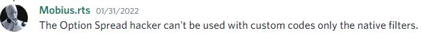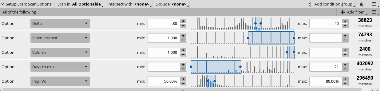 Here is an example of the 'native filters' available in the Options Hacker Scanner which are limited to the use of minimum / maximum