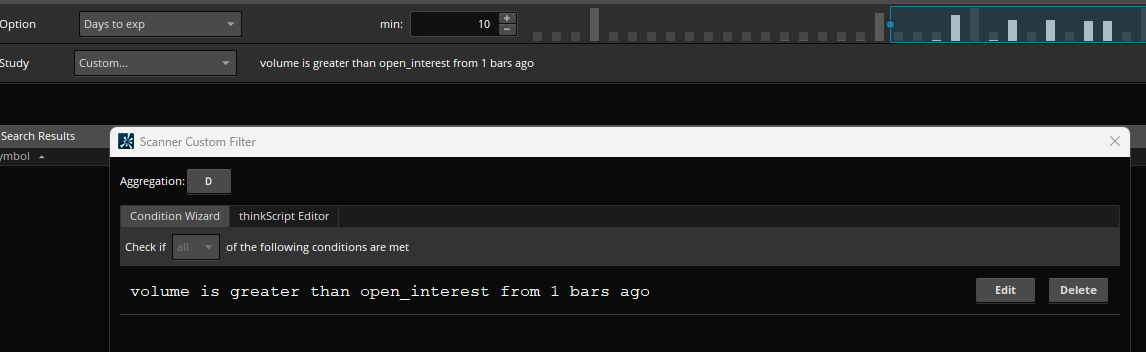 When we select Add Study in the scan , under Price , i see Volume and open interest available . Not sure this volume referring to option volume? As Price has Open interest that make me think it could be option volume. I am not getting any results