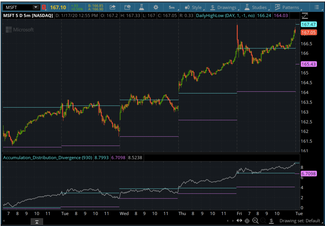 Hello @SleepyZ, I have been researching using your code, and I cannot help but say this is a masterpiece of yours. Thank you so much! I have added vertical lines ( which I took from one of your previous codes) to show last week's start and the current week's start (code attached). I humbly request that could you please modify the code so that I can see the Monthly high/low AccDist Line and Quarterly high/low AccDist Line on a Quarterly chart. Also, I request that the vertical lines be shown as "Previous Quarter Start" and "Current Quarter Start."Thanks an infinite ton!
