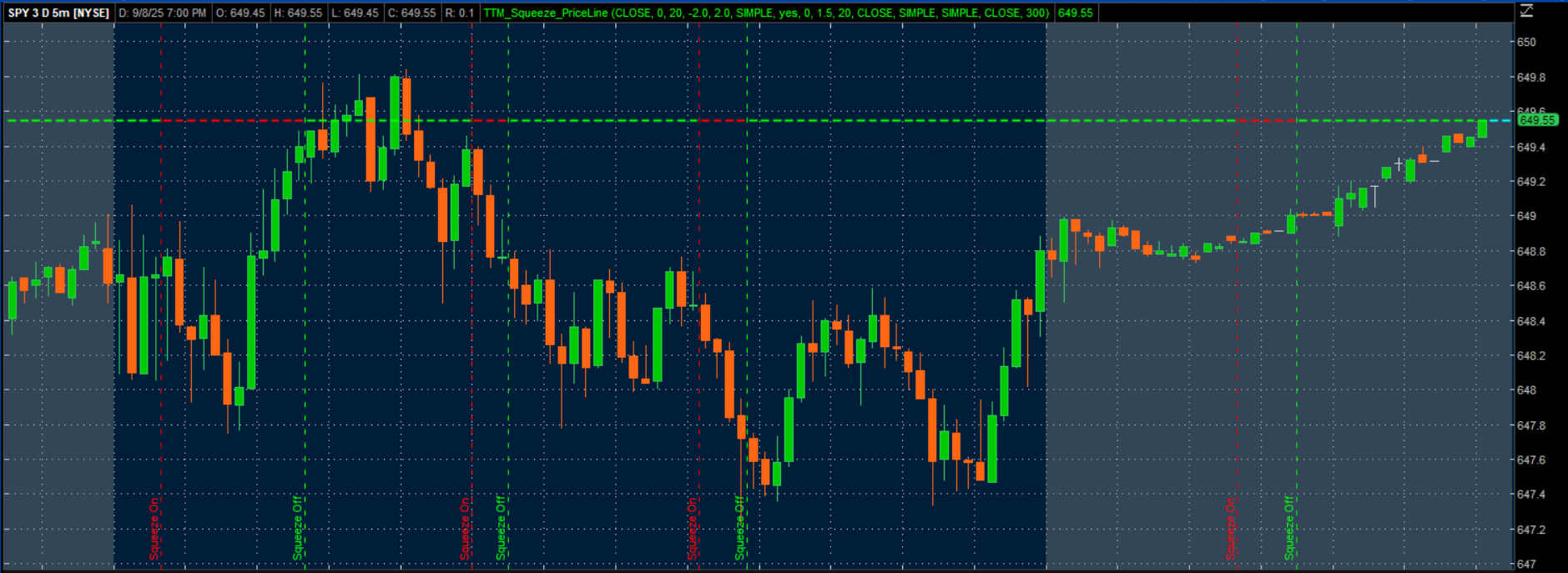 AddVerticalLine(showVerticalLines and bb_upperband crosses below kc_upperband and bb_lowerband crosses above kc_lowerband, "Squeeze On", Color.RED);