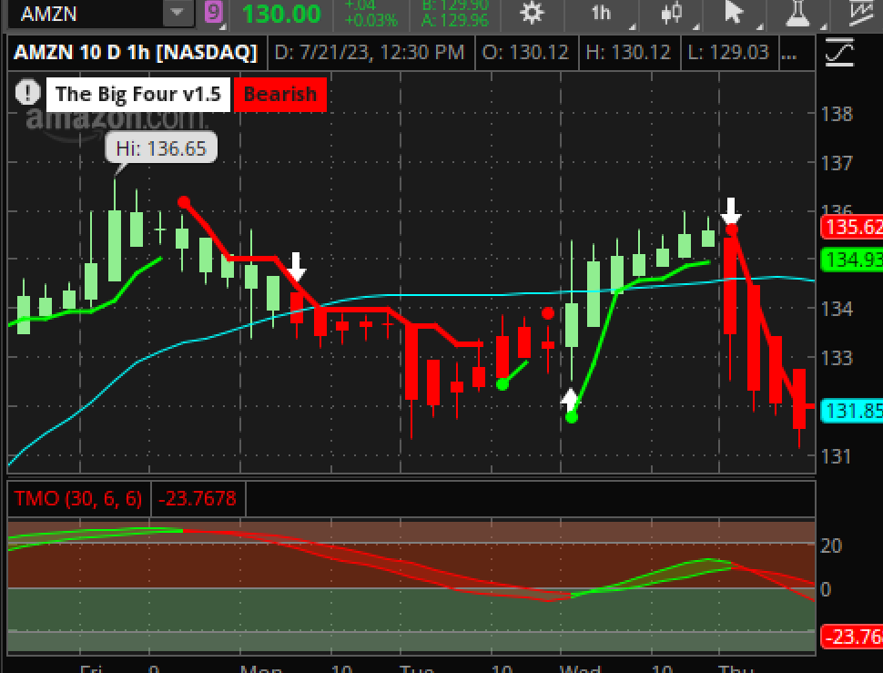 On this one for AMZN did you take the trade on July 17th @ 8.30am pstI am taking atm or 1-2 max strikes away, 2-3 weeks out but rarely have I held longer than 2-5 days. Looking back, I left lot of money on table. example: AMZN 132 put july 18. I was doing my pm research and saw it was getting rejected all day on july 17 at 135-136 hitting resistance and snapping back. I trade 1H charts and enter on 5 or 15min for better entries. Next morning I saw it open under supertrend, tmo above 0 heavy overbought territory, big4 triggered at open and I got in on 2nd candle when it closed under 50ma breach. switched to 1H candles and watched it through. 9am candle flashed big4 arrow down thats when I am getting my confirmation and watched it unfold. Closed it around noon at that doji candle. That was waay to early tmo was barely in the middle with planty of downside and daylight left. Better exit was today, you can see tmo exaustion price bounced of 200ma, 129/130 should have been the PT.