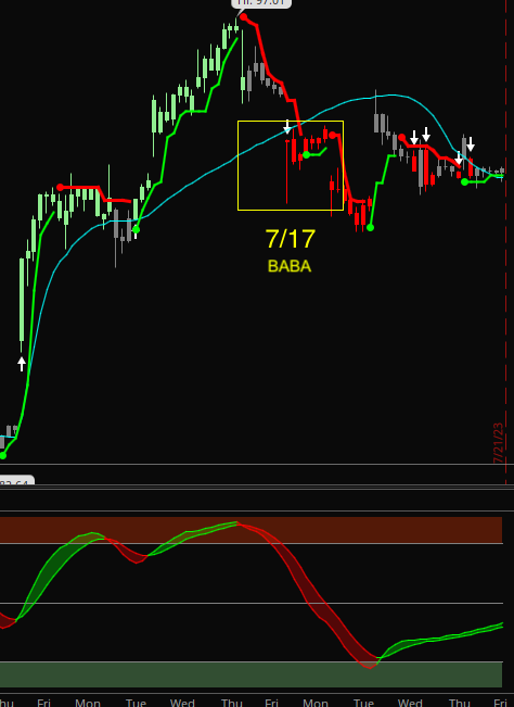 BABA you might have to tight of a stop loss or expirations that are too short? It should have paid the next day on that gap down....and it continued down for couple more dollars. Then it broke supertrend at eod on Tuesday...