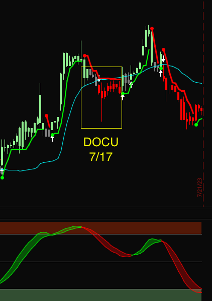 I was watching DOCU on 7/14 using the 30M and 1H. I came very close to taking this trade but instead chose FCX using 30M on 7/14. I bought 4 28-JUL Puts and closed 3 for 29% (7/17) and the last one for 17% (7/19) Only reason I didn't choose DOCU was because I have never traded that symbol and I have FCX. However, with that being said even though you might have gotten stopped out on DOCU...you had a nice down candle the next morning at the open that you could have secured nice profits...but if you didn't sell then and got stopped out it reconfirmed bearish on 7/20 and this trade would be working well. However, that 2nd confirmation signal I might not have entered because by this time it was trading in a range and that would have prevented me from entering...perhaps.