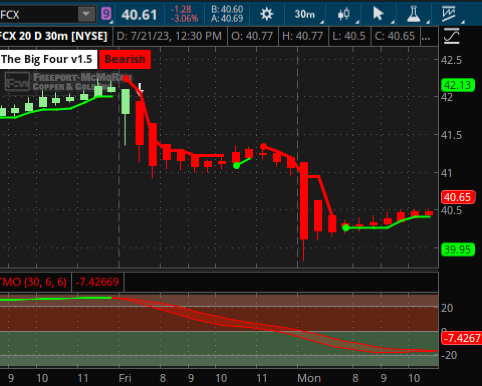 Here is a example for FCX that illbdam69 talked about on 7/14 if you see in the pic Big 4 gave a arrow downwards on 30 min chart you could play it and got out before close or next morning by 7 am pst if you pulls up the 15 min chart you will see a better pic