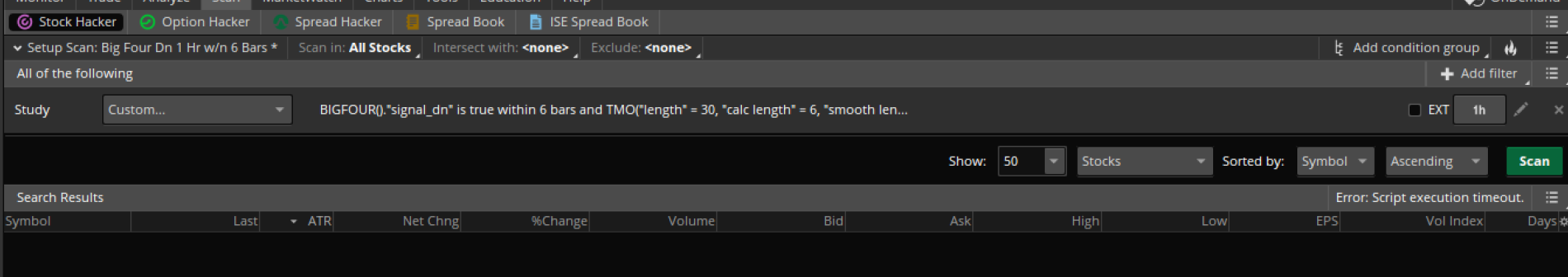 I wouldn't scan "all stocks" at least reduce this to only optionable, weekly's or S&P. I scan my "favorites" watchlist which consist about 2-300 stocks that I have filtered by bid/ask spreads, OI and Vol.