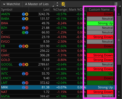 AddLabel(yes, Concat("Current Reading is ", (if Buy then "Up Trend" else if StrongBuy then "Strong Up Trend" else if Sell then "Down Trend" else if StrongSell then "Strong Down Trend" else "Neutral")),  if Buy then Color.DARK_GREEN else if StrongBuy then Color.GREEN else if Sell then Color.DARK_RED else if StrongSell then Color.RED else Color.GRAY);