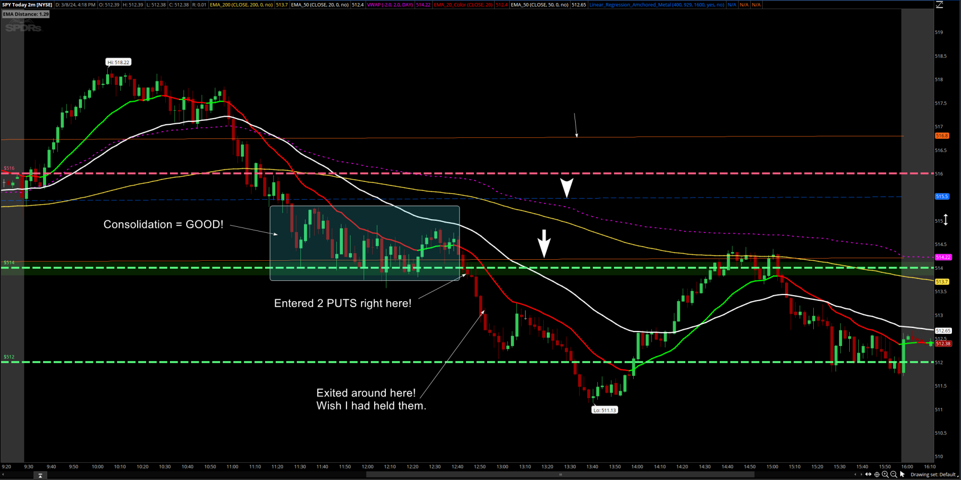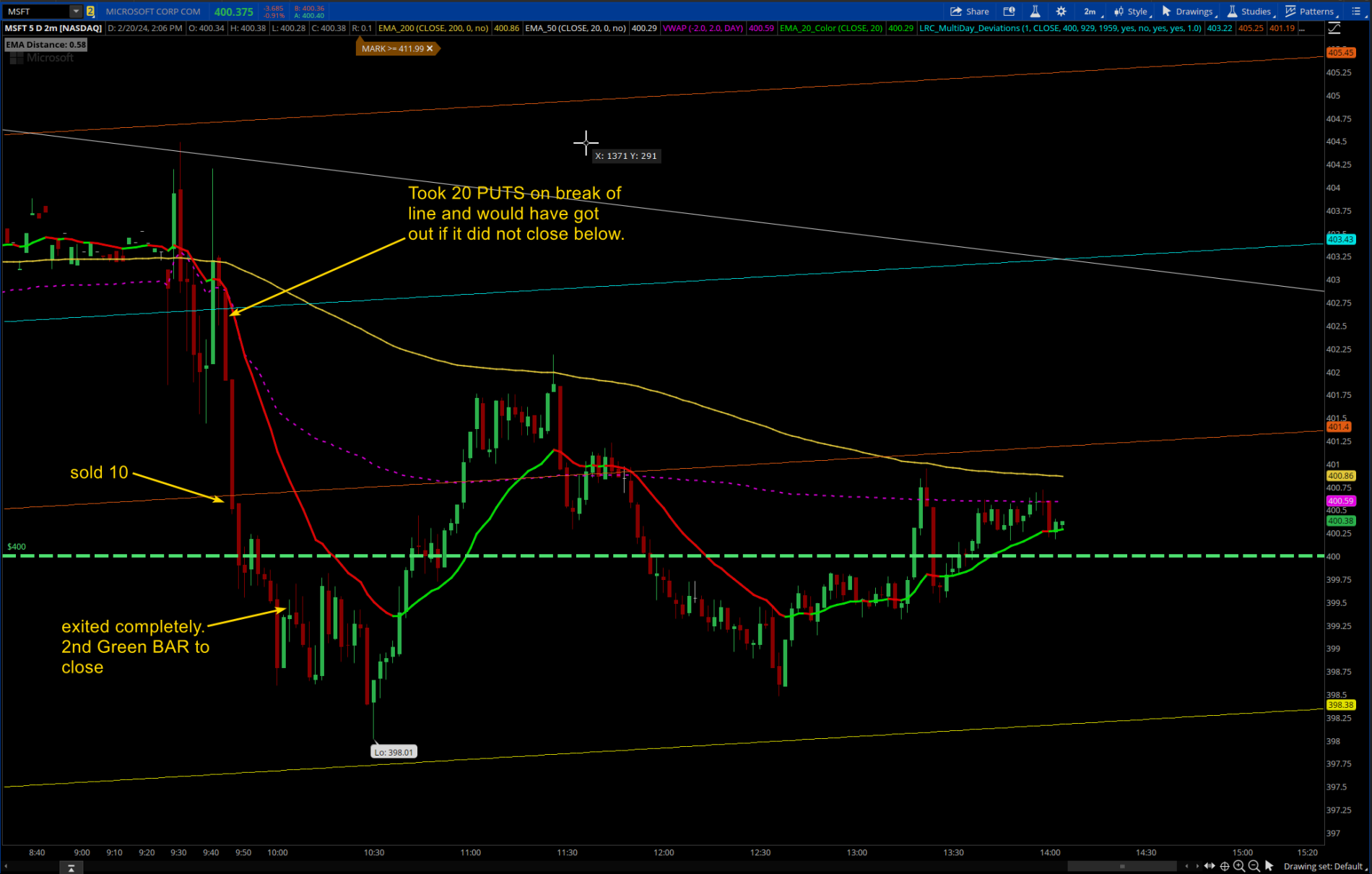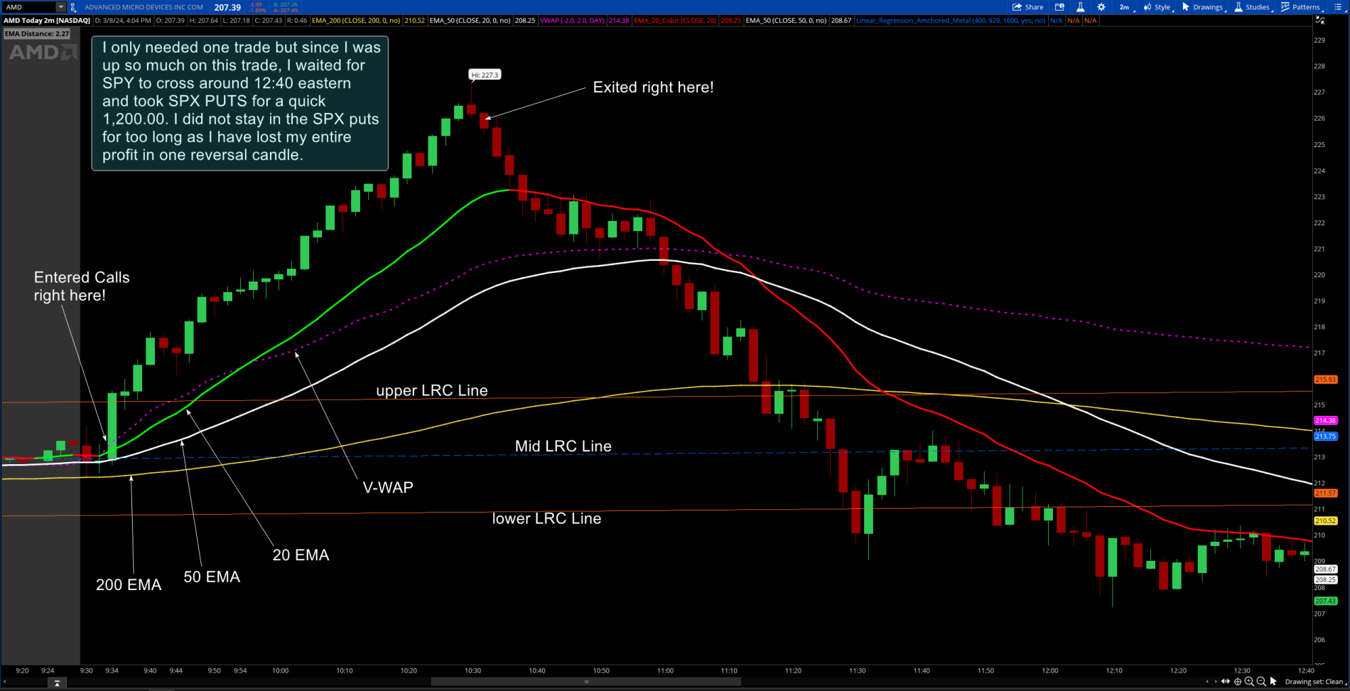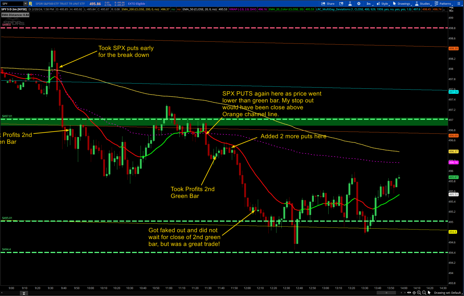 -- (Aggressive) price to be above the 200 EMA and approaching the 20 EMA at the time of LRC line cross for CALLS. Be prepared for reversal off of the 20 EMA. Same goes if you trade from the 20 EMA into the 200 EMA. (This is riskier but can yield great trades)