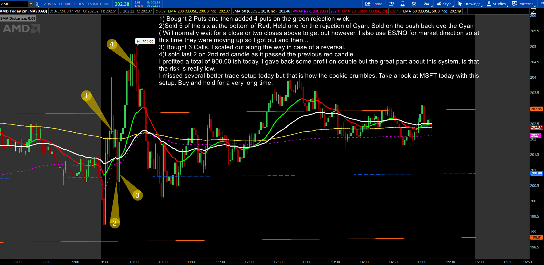 4) I scale out as I go. If price reaches a level of interest I will scale out and see if there is a rejection or a continuation through that area. This could be S/R, Pre day low/high, Pre market Low/High etc..