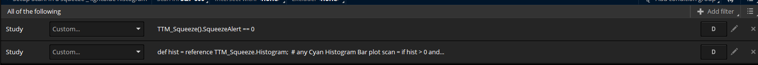 hi @wtf_dude ! i love your shares. Is there any way to make these into labels for the chart? interested in the histo flip pos/neg, the histo shift from red/yellow and teal/royalblue, and last and best... the dots!!!!Oh no, you have to put it with the code I posted earlier. Just create a new study, call it something like AdvancedSqueezeScanner and paste all of this and then use it on the scan tab. Should be go to go.