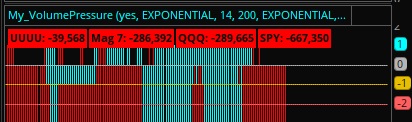 I like my indicators to be easy on the eyes and intuitive just by a quick look. So, here is a volume pressure indicator that not only measures the chart asset, but it calculates the Magnificent 7, QQQ, and SPY. When the colors are all the same enter the trade! Can be used on any time frame.