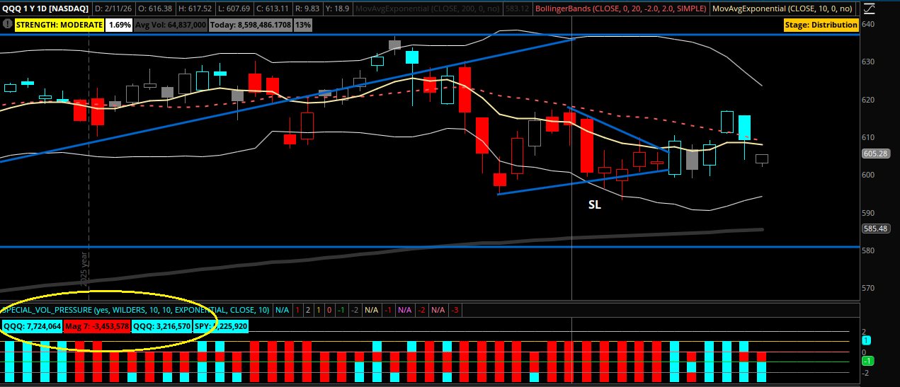 SQL:declare lower; # ────────────────────────────────────────────────────────────────── # Inputs # ────────────────────────────────────────────────────────────────── input PaintBars = yes; # Volume Pressure Inputs input Volume_AvgType = AverageType.EXPONENTIAL; input Volume_Length = 14; input Volume_AvgLength = 200; # Moving Average Inputs input MovAvg_AvgType = AverageType.EXPONENTIAL; input MovAvg_Price = close; input MovAvg_Length = 20; # ─────────────────────────────────────────────────────────────────────── # Raw Data # ─────────────────────────────────────────────────────────────────────── def vol = volume; def selling = vol * (high - close) / (high - low); def buying = vol * (close - low) / (high - low); def buyV_ma = MovingAverage(Volume_AvgType, buying, Volume_Length); def sellV_ma = MovingAverage(Volume_AvgType, selling, Volume_Length); def MA = MovingAverage(MovAvg_AvgType, MovAvg_Price, MovAvg_Length); addlabel(yes, GetSymbol() +": " + round(buyV_ma - sellV_ma,0), if buyV_ma > sellV_ma then color.cyan else color.red); plot Dot_Cyan = if buyV_ma > sellV_ma and close > MA then 1 else Double.NaN; Dot_Cyan.SetPaintingStrategy(PaintingStrategy.Histogram); Dot_Cyan.SetLineWeight(3); Dot_Cyan.AssignValueColor(Color.CYAN); plot Dot_Red = if buyV_ma < sellV_ma and close < MA then 1 else Double.NaN; Dot_Red.SetPaintingStrategy(PaintingStrategy.Histogram); Dot_Red.SetLineWeight(3); Dot_Red.AssignValueColor(Color.RED); plot pos2Line = 2; plot pos1Line = 1; plot ZeroLine = 0; plot neg1Line = -1; plot neg2Line = -2; AssignPriceColor( if PaintBars and !IsNaN(Dot_Cyan) then Color.CYAN else if PaintBars and !IsNaN(Dot_Red) then Color.RED else Color.GRAY ); # ──────────────────────────────────────────────────────────────────────── # 4) Magnificent Seven aggregate dots at 0/100 # ──────────────────────────────────────────────────────────────────────── script VolumePressure { input sym = "AAPL"; def o = open(sym); def h = high(sym); def l = low(sym); def c = close(sym); def v = volume(sym); def uw = if c>o then h-c else h-o; def lw = if c>o then o-l else c-l; def sp = h - l; def bd = sp - (uw + lw); def pctB= bd / sp; def pctW= (uw + lw) / sp; def buyR = if c>o then (pctB + pctW/2) * v else (pctW/2) * v; def sellR = if c<o then (pctB + pctW/2) * v else (pctW/2) * v; plot Buy = MovingAverage(AverageType.EXPONENTIAL, buyR, 14); plot Sell = MovingAverage(AverageType.EXPONENTIAL, sellR, 14); } def avgBuy = ( VolumePressure("AAPL").Buy + VolumePressure("MSFT").Buy + VolumePressure("GOOGL").Buy + VolumePressure("AMZN").Buy + VolumePressure("META").Buy + VolumePressure("TSLA").Buy + VolumePressure("NVDA").Buy ) / 7; def avgSell = ( VolumePressure("AAPL").Sell + VolumePressure("MSFT").Sell + VolumePressure("GOOGL").Sell + VolumePressure("AMZN").Sell + VolumePressure("META").Sell + VolumePressure("TSLA").Sell + VolumePressure("NVDA").Sell ) / 7; addlabel(yes, "Mag 7: " + round(avgBuy - avgSell,0), if avgBuy > avgSell then color.cyan else color.red); plot Cyan_M7 = if avgBuy > avgSell then -1 else Double.NaN; Cyan_M7.SetPaintingStrategy(PaintingStrategy.Histogram); Cyan_M7.SetLineWeight(3); Cyan_M7.AssignValueColor(Color.CYAN); plot Red_M7 = if avgBuy < avgSell then -1 else Double.NaN; Red_M7.SetPaintingStrategy(PaintingStrategy.Histogram); Red_M7.SetLineWeight(3); Red_M7.AssignValueColor(Color.RED); def qqqBuy = VolumePressure("QQQ").Buy; def qqqSell = VolumePressure("QQQ").Sell; addlabel(yes, "QQQ: " + round(qqqBuy - qqqSell,0), if qqqBuy > qqqSell then color.cyan else color.red); plot Cyan_QQQ = if qqqBuy > qqqSell then -2 else Double.NaN; Cyan_QQQ.SetPaintingStrategy(PaintingStrategy.Histogram); Cyan_QQQ.SetLineWeight(3); Cyan_QQQ.AssignValueColor(Color.CYAN); plot Red_QQQ = if qqqBuy < qqqSell then -2 else Double.NaN; Red_QQQ.SetPaintingStrategy(PaintingStrategy.Histogram); Red_QQQ.SetLineWeight(3); Red_QQQ.AssignValueColor(Color.RED); def spyBuy = VolumePressure("SPY").Buy; def spySell = VolumePressure("SPY").Sell; addlabel(yes, "SPY: " + round(spyBuy - spySell,0), if spyBuy > spySell then color.cyan else color.red); plot Cyan_SPY = if spyBuy > spySell then -3 else Double.NaN; Cyan_SPY.SetPaintingStrategy(PaintingStrategy.Histogram); Cyan_SPY.SetLineWeight(3); Cyan_SPY.AssignValueColor(Color.CYAN); plot Red_SPY = if spyBuy < spySell then -3 else Double.NaN; Red_SPY.SetPaintingStrategy(PaintingStrategy.Histogram); Red_SPY.SetLineWeight(3); Red_SPY.AssignValueColor(Color.RED);