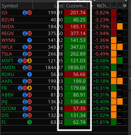 I wanted to quickly know if the stock price is currently above or below VWAP (Volume Weighted Average Price). One of our developers were able to help me put together a watchlist column that shows just that. Here is what it looks like.