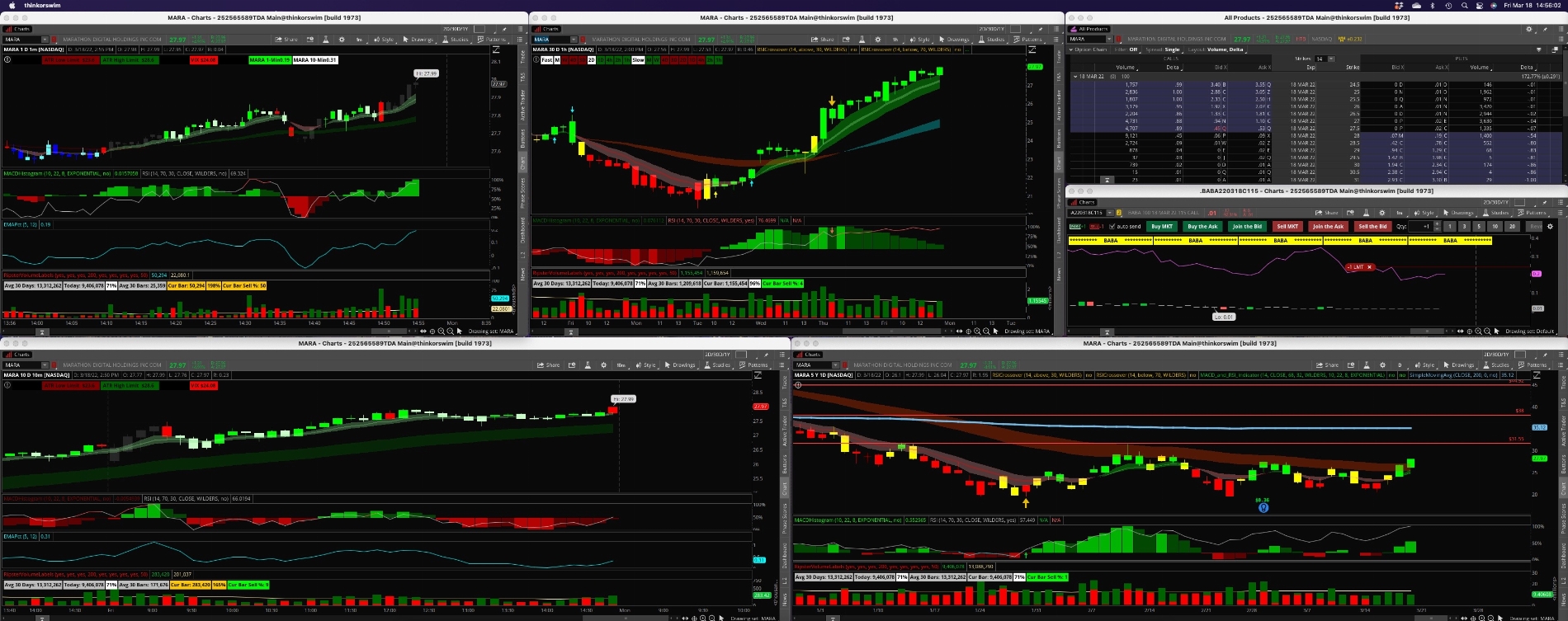 As you can see in this screen shot I have a label in the upper left box that says MARA 0.19 which is the distance between the 5 and 12 EMA on the 1 minute chart and MARA 0.31 which is the distance between the 5 and 12 EMA on the 10 minute chart. This is just another confirmation of trend for me. I want them both to be green for Calls or both blue for Puts.